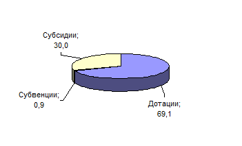 Рассмотрев структуру финансовой помощи местного бюджета в 2004 году (табл. 2.11), можно сказать, что ее доля составила 74,6% от общего объема поступления или 201643 тыс.руб. Финансовая помощь поступала в виде дотаций, удельный вес которых составил 69,6% или 140353 тыс.руб., а также в виде субсидии, доля которых 30,3% или 61143 тыс.руб. На рис. 2.12. представлена диаграмма безвозмездных поступлений в 2004 году. На дотационное финансирование приходится наибольший процент. В анализируемом периоде с вышестоящего бюджета дотации поступали: