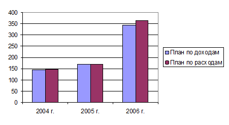 Рис. 2.18. Динамика плановых показателей доходной и расходной частей бюджетов за 2004-2006 гг., тыс.руб.