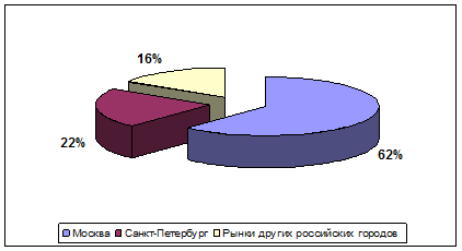 Из диаграммы видно, что рынок кейтеринга в России на 62% сконцентрировался в Москве, на 22% - в Санкт-Петербурге, и 16% занимает доля других городов. Такой низкий показатель в регионах говорит о том, что кейтеринг за пределами столичного рынка только начинает развиваться.