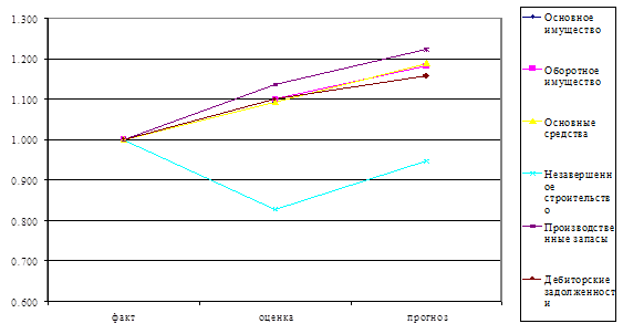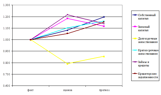 Соотношение разделов пассива также оптимально и составляет, соответственно, собственные средства по факту 51,3%, по оценке 51,0%, по прогнозу 52,2%; заемные средства (долгосрочные обязательства и краткосрочные пассивы) по факту 47,6%, по оценке 48,2%, по прогнозу 47.02%.