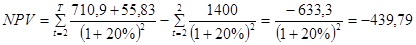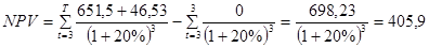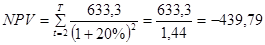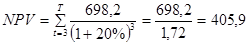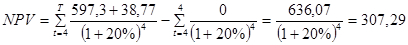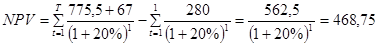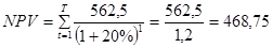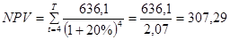 Таким образом, чистый приведённый доход составит: за первый год – 468,75 тыс. руб.; за второй год – -439,79 тыс. руб.; за третий год – 405,9 тыс. руб.; за четвёртый год – 307,29 тыс. руб.