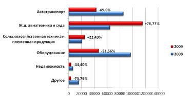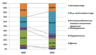 Объем сделок с оборудованием в 2009 году составил 47,01 млрд рублей, уменьшившись вдвое. Число заключенных контрактов также сократилось почти в два раза. При этом средняя стоимость договора уменьшилась с 9,05 млн до 8,5 млн рублей. Сложности с открытием крупных кредитных линий способствовали переориентации спроса лизингополучателей на более дешевые и быстроокупаемые предметы лизинга.