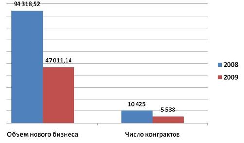 В целом сокращение рынка по сравнению с показателями 2008 года составило порядка 330%. Уменьшение объемов нового бизнеса в 2009 году могло было быть более значительным. Удержать вес получилось во многом благодаря крупным контрактам в сегменте big ticket (авиация, железнодорожный транспорт и суда), заключенным тремя крупнейшими компаниями — «Ильюшин Финанс Ко», «Сбербанк Лизинг» и «ВЭБ-Лизинг». Более того, именно сделки компании «Ильюшин Финанс Ко» на поставку в течение следующих двух лет 60 новых самолетов «Ан-148», «Ил-96» и «Ту-204» общей стоимостью свыше 50 млрд рублей обеспечили более 20% нового бизнеса всей лизинговой отрасли в 2010 году. Также значительная доля пришлась на «Росагролизинг», заключивший в 2009 году сделок на 35,1 млрд рублей.