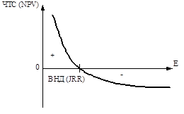 Для таких инвестиций справедливо утверждение о том, что чем выше норма дисконта (Е), тем меньше величина интегрального эффекта (NPV), что как раз и иллюстрирует рис.3.4.