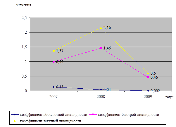 - коэффициент быстрой ликвидности, показывающий, какая часть текущих обязательств может быть погашена за счет имеющихся денежных средств и ожидаемых финансовых поступлений, этот показатель соответствует нормативному значению в 2007-2008гг., но резко снижается в 2009г.