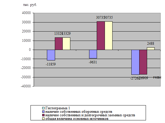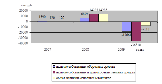 По данным рисунка 2.7 видно, что на предприятии ОАО «Нефтекамск-Лада-Сервис» в 2007 и 2008 годах источников формирования запасов и затрат хватало, а в 2009 г. наблюдается не хватка собственных оборотных средств, резкое снижение долгосрочных заемных источников и напротив впервые за анализируемый период в 2009г. предприятие берет крупную сумму краткосрочных обязательств, а именно кредит на сумму 29750 тыс. руб.