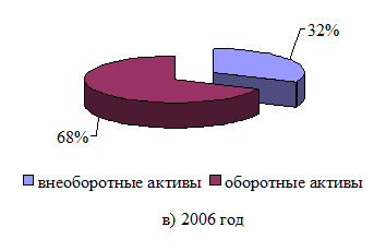 К концу 2005 года удельный вес внеоборотных активов уменьшился на 10% по сравнению с 2004 годом, и составил 26,9%, а удельный вес оборотных увеличился на 10% и составил 73,1%. Что касается 2006 года, то к концу года удельный вес внеоборотных активов увеличился на 4,7% и составил 31,6%, а удельный вес оборотных активов уменьшился на 5,3% и составил 68,4% в сумме активов.