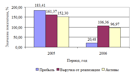 Рисунок 14 – Динамика темпов роста прибыли, выручки и активов в 2005 и 2006 годах