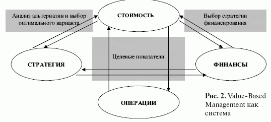 Современная концепция Value-Based Management (далее - VBM) направлена на качественное улучшение стратегических и оперативных решений на всех уровнях организации за счет концентрации усилий на ключевых факторах стоимости для достижения цели - максимизации стоимости компании. Принцип максимизации стоимости не определяет направления развития бизнеса и источники роста стоимости компании, но задает единое направление для анализа и оценки результатов деятельности, систему координат для управления, как отдельными подсистемами, так и организацией в целом в процессе реализации стратегии (рис. 2).