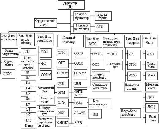 Наиболее широкое распространение получила линейно-функциональная организационная структура управления. Линейные руководители при ней являются единоначальниками и полностью отвечают за работу подразделения (директор, зам. директора по производству, начальник цеха, начальник участка, старший мастер, мастер, бригадир). Функциональные руководители (главный инженер, главный экономист, главный бухгалтер и т.д.) составляют штаб директора и руководят функциональными службами (ОГК, ОГМ, ОГЭ и т.д.).