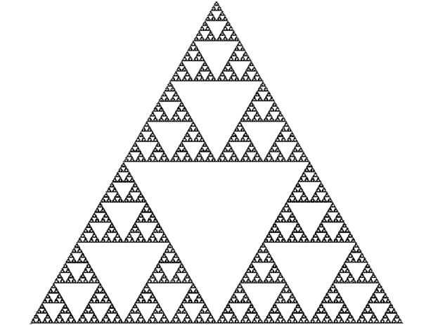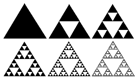 Пусть начальное множество S0 --- равносторонний треугольник вместе с областью, которую он замыкает. Разобьем S0 на четыре меньшие треугольные области, соединив отрезками середины сторон исходного треугольника. Удалим внутренность маленькой центральной треугольной области. Назовем оставшееся множество S1 (рис. 2.3.2). Затем повторим процесс для каждого из трех оставшихся маленьких треугольников и получим следующее приближение S2. Продолжая таким образом, получим последовательность вложенных множеств Sn, чье пересечение образует ковер S.