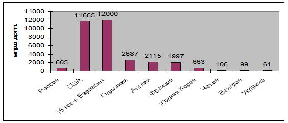 Наилучшим выходом является первый вариант. Обратимся к макрохарактеристикам нашей экономики и нашего банковского рынка (рисунок 1). Здесь явно бросается в глаза огромный разрыв по ВВП. Преодолеть этот разрыв невозможно, если мы при этом имеем аналогичный разрыв и по характеристикам банковского рынка. На международном политическом поле не может быть мощной державы без развитой экономики.