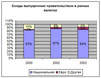83% всех правительственных обязательств деноминированы в национальной валюте. Доля выпуска долговых обязательств, в американских долларах и евро (включая немецкую марку) составили 15% и 2% соответственно.