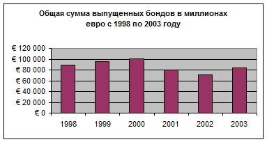 Объем рынка долговых обязательств Литвы в конце 2000 года составил €1,639 миллионов, что составляет 13% от ВВП (2.8.1. рис.). Из них на долю правительственных долговых обязательств пришлось €1,558 миллионов [2] 71. Большая часть из них была выпущена на иностранных рынках. В 2000 году не выпускалось никаких бондов денежно-кредитными финансовыми учреждениями.