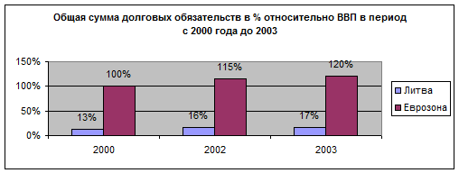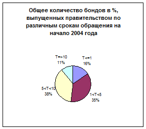 Объем рынка долговых обязательств составил €2,344 миллионов в конце 2002 года, составляя 16% от ВВП (2.8.1. рис.) [3]. Доля выпуска правительственных бондов составила €2,241 миллионов. Доля долговых обязательств выпущенных нефинансовыми и не денежно-кредитными финансовыми корпорациями была незначительна и составила только 4%. Все краткосрочные правительственные бонды деноминированны в национальной валюте. Долгосрочные правительственные долговые обязательства денаминированны в национальной валюте, составили 29% от общей суммы. Эти долговые обязательства, имеют следующее распределение: со сроком действия до одного года - 21%, от одного до пяти лет - 41%, от пяти до десяти - 34%, более десяти лет - 4% (2.8.4. рис.). На рисунке (2.8.3.) видно, что в 2000 году в Литве не выпускались бонды с продолжительностью более 10 лет, а на рисунке (2.8.5.) к началу 2004 года их объем уже составляет 11%. Анализируя динамику увеличения доли долгосрочных бондов можно говорить, что экономика Литвы находится в нормальной стадии развития.