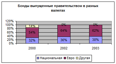 Больше чем половина государственных бондов деноминированны в евро, и приблизительно одна треть в национальной валюте. Около 14% правительственных долговых обязательств были деноменированны в американских долларах (2.8.2. рис.). Большая часть правительственных долговых обязательств деноминированных в национальной валюте были краткосрочными бондами. Такие ценные бумаги составляли половину от общей суммы. Правительственные долговые обязательства, выпущенные в национальной валюте, составили 10% от общего количества. Не было выпущено ни каких правительственных долговых обязательств с первоначальным сроком действия дольше, чем десять лет.