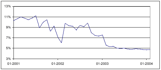 Этот индикатор только до некоторой степени выполняет согласованные статистические понятия. Индикатор был довольно устойчив с начала 2003 года. 12-месячное среднее значение в феврале 2004 - 4.9%.