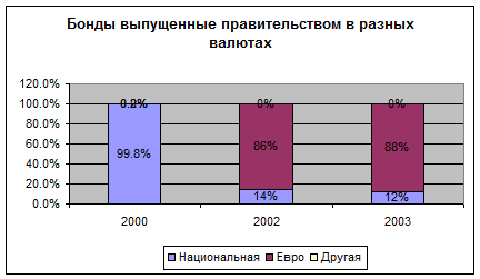 В 2002 году центральное правительство выпустило евробондов на сумму €100 миллионов, большинство долговых обязательств, выпущенных центральным правительством деноминировано в евро (86%). Остающиеся 14% центральных правительственных бондов были выпущены в национальной валюте - в эстонских кронах (EEK).