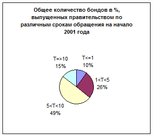 В конце 2000 года, почти половина долговых обязательств, выпущенных государством в национальной валюте (49%) имели срок действия от 5 до 10 лет, 26% - от 1 до 5 лет, 15% - 10 и более лет и 10 % имели срок действия до одного года (2.10.4. рис.) [2].