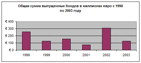 Объем рынка долговых обязательств на конец декабря 2002 года составил €235 миллионов или 3% от ВВП (2.10.1. рис.). Из них: