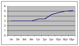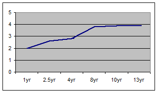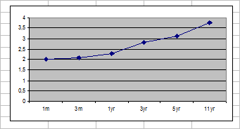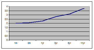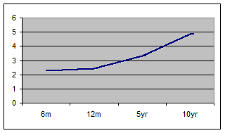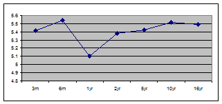 На следующих графиках можно увидеть, как еще может выглядеть опережающий индикатор – Кривая доходности. Если в первых случаях она выглядела, так как должна выглядеть в нормальных условиях, то эти формы кривой сигнализируют, предупреждают или сообщают, что в стране с экономикой что-то не в порядки или ожидаются значительные перемены. И это очевидно и не вооруженным взглядом, т.к. нелогично, когда те, кто вкладывают деньги на более короткий срок получают значительно большее вознаграждение, чем те, кто вкладывают средства на более длительный период, рискуя гораздо больше, чем первые.