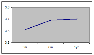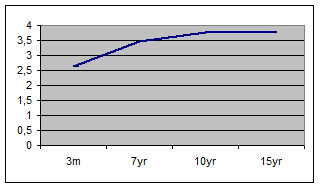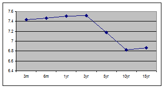 Все кривые доходности первых 7 стран довольно плавно поднимаются с низу вверх – это значит, что имеется теоретическое обоснование, что бы предположить, что экономика этих стран находится в нормальной стадии развития и не о каких кризисах и перепадах в прогнозируемой перспективе говорить на данном этапе у нас нет оснований с точки зрения кривой доходности, как опережающего макроэкономического индикатора. Это нормальное состояние процентных ставок, когда они постепенно увеличиваются с увеличением срока продолжительности долговых обязательств. Это положительный факт, когда разница между процентными ставками бондов с самым маленьким сроком продолжительности и самым большим приблизительно равна 2 пункта.