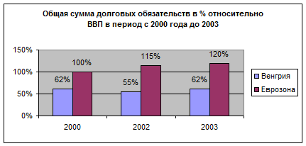 Объем рынка долговых обязательств в конце 2002 года превысил €38,556 миллионов, что составило 55% от ВВП (2.3.1. рис.) [3]61. Больше чем 80% от общей суммы выпущенных долговых обязательств являлись государственными бондами, а остальные, чуть меньше 20% были выпущены денежно-кредитными финансовыми учреждениями (прежде всего Национальным Банком Венгрии).