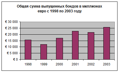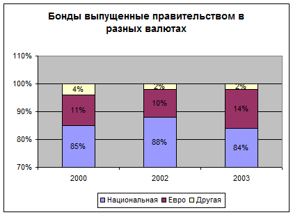 Общая сумма долговых обязательств, выпущенных к началу 2004 года составили €45,490 миллионов, что составляет 62% от ВВП (2.3.1. рис.) [4]. Более чем 79% от всех бондов выпущены центральным правительством. Менее чем 9% выпущены монетарными финансовыми организациями и менее чем 2% выпущены нефинансовыми и немонетарными финансовыми организациями. К началу 2004 года 84% долговых обязательств выпущенных центральным правительством были деноминированы в национальной валюте и около 14% были выпущены в евро (2.3.2. рис.). Все остальные бонды были выпущены в другой валюте.