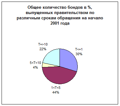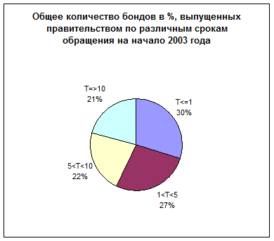 27% государственных бондов имели срок обращения более одного года, но менее пяти лет. 33% бондов имели срок обращения, пять лет и более, но меньше 10 лет. 22% имели срок обращения десять лет и более.