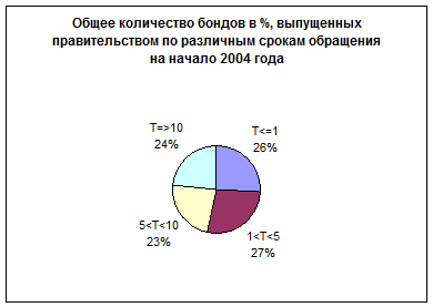 К началу 2004 года 27% долговых обязательств, выпущенных в национальной валюте центральным правительством имели срок обращения более одного года, но менее чем пять лет, 23% имели срок обращения пять лет и более, но меньше 10 лет и 24% имели срок обращения десять лет и более (2.3.5. рис.).