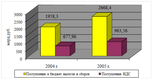 Поступления налога на добавленную стоимость на товары (работы, услуги), реализуемые на территории Российской Федерации, в 2005 году составили 963,56 млрд. рублей и по сравнению с 2004 годом выросли на 285,6 млрд. рублей, или в 1,4 раза. Суммы, фактически возмещенные налогоплательщикам по налоговой ставке 0 процентов, в 2005 году составили 466,7 млрд. рублей, что на 42,7% больше, чем в 2004 году (темп роста экспорта за январь-ноябрь 2005 года относительно января-ноября 2004 года составил 136,6%). Налога на добавленную стоимость на товары, ввозимые на территорию Российской Федерации из Республики Беларусь, поступило в 2005 году 20,9 млрд. рублей.