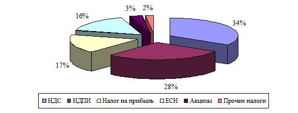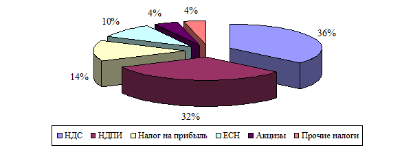 Рис. 1.2.3. Структура поступлений администрируемых ФНС РФ доходов в федеральный бюджет по видам налогов в 2004г. (в %)