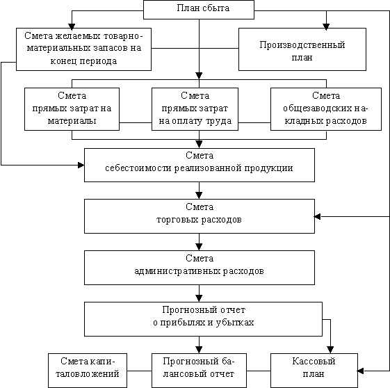 Отправной точкой бюджетирования выступает план сбыта или т.н. бюджет продаж. Бюджет продаж закладывает основные позиции производственного плана, сметы товарно-материальных запасов, плана поступления денежных средств и графика выплат денежных средств. Именно план сбыта определяет и содержание кассового бюджета (кассового плана) предприятия. План сбыта должен определять реальные возможности предприятия в конкретных условиях. Поэтому бюджет продаж должен составляться в нескольких вариантах в зависимости от ситуации на рынке сбыта. На рис. 1 изображена схема формирования бюджета предприятия
