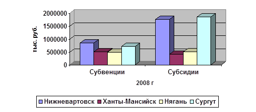 Рис 2.1 Сравнительная характеристика межбюджетных отношении за 2008г. городов ХМАО-ЮГРЫ