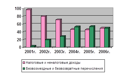 Таким образом, сокращение числа налоговых и неналоговых доходов местных бюджетов с 2001 – по 2006гг сокращается с 97% до 71%, что связано с изменение в округе налогового законодательства, ликвидацией ряда местных налогов, проводимой политикой централизации основных налоговых источников, ростом расходов муниципалитетов.[127]