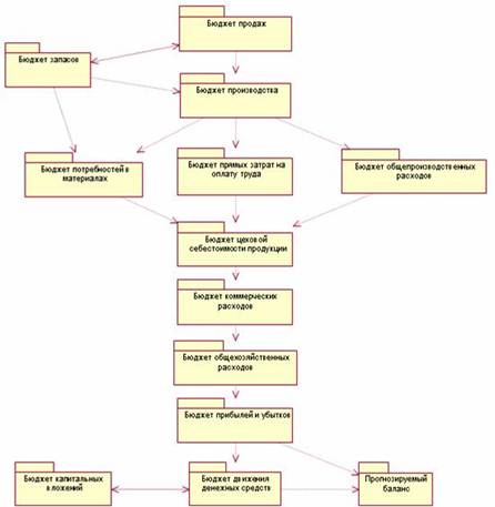 Операционный и финансовый бюджет образуют генеральный бюджет предприятия (Рис. 1). Существуют и другие взаимосвязи в частности, бюджет потребностей в материалах влияет на бюджет движения денежных средств, но эта зависимость на схеме не показана.