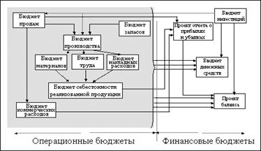 В основе бюджетирования лежит общий (главный) бюджет, который представляет собой скоординированный по всем подразделениям или функциям план работы для предприятия в целом. Он состоит из бюджетов двух основных видов: операционных и финансовых[9]. Структура взаимосвязи бюджетов представлена на рисунке 3.