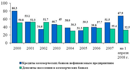 Прирост денежного предложения в немалой степени связан с увеличением кредитной активности банков. Наблюдается ускорение темпов роста кредитов предприятиям. В 2007 г. они увеличились на 52%, а на 1 апреля 2008 г. годовой прирост составил 68%. Этот процесс происходит наряду с замедлением динамики депозитов населения (рис. 2).