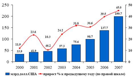 Одним из существенных источников роста кредитов в последние годы являются внешние заимствования предприятий и банков. Внешний долг частного сектора увеличился с 262 млрд.долл.США на начало 2007 г. до 413 млрд.долл.США на начало 2008 года. При этом консолидированный внешний долг Российской Федерации на 1 января 2008 г. составил 460 млрд.долл.США, а золотовалютные резервы на ту же дату составили 476 млрд.долл.США.
