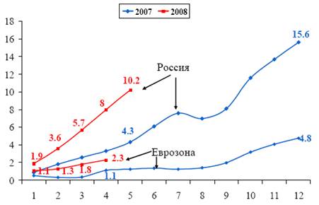По состоянию на 16 июня 2008 г. индекс потребительских цен составил 8,3% против 5,1% за аналогичный период 2007 года (рис. 5).