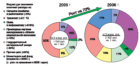 В 2006–2008 годах, как и в предыдущие годы, государственная поддержка отдельных отраслей экономики из федерального бюджета будет концентрироваться на развитии инфраструктуры общенационального и межрегионального значения, стимулирования развития высокотехнологичных отраслей, внедрении новаций, содействии прогрессивным структурным сдвигам в экономике. В составе этих расходов — создаваемый с 2006 года Инвестиционный фонд, средства которого (в объеме около 70 млрд. рублей) будут направляться на реализацию совместно с частными инвесторами особо значимых инвестиционных и инновационных проектов.