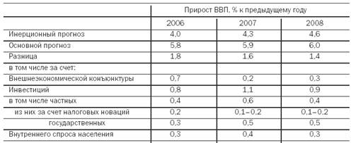 Результатом проводимой в 2006–2008 годах бюджетной и экономической политики станет создание благоприятных условий для развития экономики и существенное ускорение по сравнению с инерционным прогнозом темпов экономического роста за счет внутренних факторов: