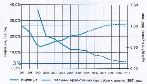Первое. Превращение федерального бюджета в эффективный инструмент макроэкономического регулирования. В перспективе должно быть обеспечено снижение инфляции до приемлемого уровня 3 - 4 процента в год. Этому будут способствовать соблюдение принципа адекватности реальных темпов роста бюджетных расходов темпам роста экономики с учетом планируемого на перспективу снижения налогового бремени, проведение взвешенной политики в сфере использования конъюнктурных сверх доходов от экспорта углеводородов, регулирование тарифов на продукцию субъектов естественных монополий, а также реализация бюджетных программ, направленных на устранение инфраструктурных ограничений в экономике, провоцирующих дополнительный рост цен (рис. 1).