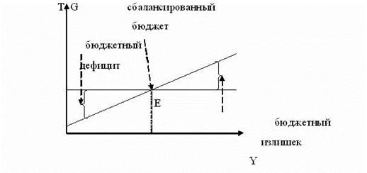 Рис.1. Государственные расходы, налоговые поступления и дефицит государственного бюджета G - государственные расходы; T - налоговые поступления; Y - доход. В точке E - сбалансированный бюджет, т.е. налоговые поступления равны государственным расходам T=G