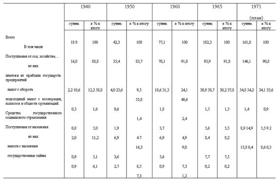 Табл.2.1 демонстрирует, что основную часть доходов бюджета СССР составляли поступления от социалистических предприятий, составляющие более 90% всех его доходов. Эти поступления увеличиваются в результате развития быстрыми темпами всех отраслей социалистического хозяйства. Доходы социалистических предприятий вносятся в бюджет в виде платежей из прибыли [плата за производственные фонды, фиксированные (рентные) платежи, взносы свободного остатка прибыли], налога с оборота, взносов государственных предприятий на государственное социальное страхование и некоторых других платежей. Платежи из прибыли в бюджет в связи с проведением с 1966 экономической реформы перестроены таким образом, чтобы повысить заинтересованность работников предприятий в расширении производства, его техническом совершенствовании и увеличении прибыли. Для этого более значительная, чем прежде, часть прибыли оставляется в распоряжении предприятий на расширение производства (капиталовложения, прирост оборотных средств и др.) и отчисляется в фонды материального поощрения их работников. Налог с оборота полностью вносится предприятиями в бюджет. Платежи населения занимали в 1970 менее 10% всех доходов бюджета. Роль их в послевоенный период значительно снизилась в связи с освобождением многих плательщиков полностью или частично от уплаты налогов, отменой в 1957 выпуска государственных внутренних займов, реализуемых по подписке. Рост абсолютной суммы налогов с населения связан с увеличением численности рабочих и служащих и фонда их зарплаты и средней зарплаты при одновременном снижении ставок обложения.