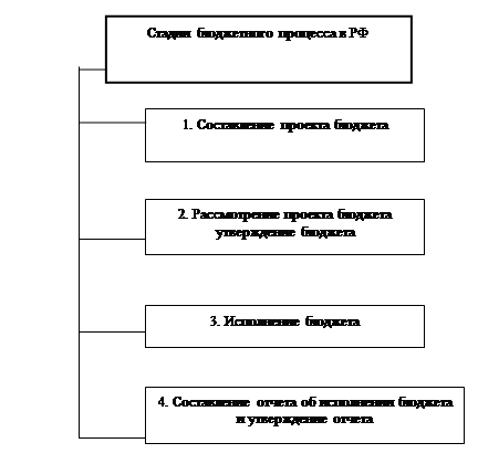 Бюджетный процесс в Российской Федерации состоит из следующих стадий бюджетной деятельности: составление проекта бюджета; рассмотрение проекта бюджета и утверждение бюджета; исполнение бюджета; составление и утверждение отчета об исполнении бюджета. Стадии бюджетного процесса РФ показаны на схеме (рис. 1).