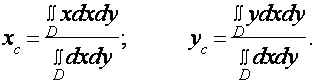 интегральные суммы, стоящие в числителях и знаменателях дробей, перейдут в двойные интегралы, таким образом получаются точные формулы для вычисления координат центра тяжести плоской фигуры:
