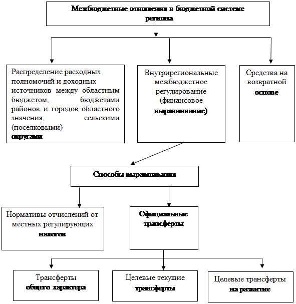 Межбюджетные отношения в бюджетной системе региона проявляются через регулирование взаимоотношений между разными уровнями местного государственного управления: между областным бюджетом, с одной стороны, и бюджетами районов и городов — с другой. Специфической особенностью данного уровня межбюджетных отношений является то, что здесь движение финансовых средств происходит не в сфере государственных финансов, а затрагивает формально обособленную сферу местных финансов. Внутрирегиональная система межбюджетных отношений представляет собой тот этап бюджетного процесса, при котором окончательно формируются финансово-бюджетные ресурсы всех уровней власти и управления в стране (рисунок 15).