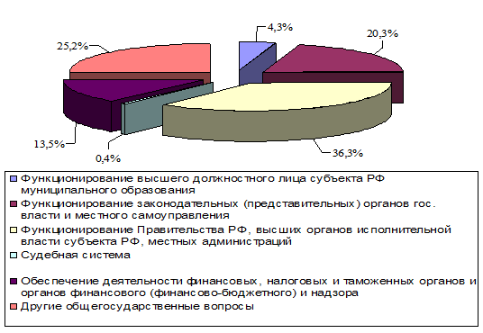 По данным рисунка 7 видно, что наибольший удельный вес среди расходов на содержание органов государственной власти РФ занимают расходы, на функционирование Правительства РФ, высших органов исполнительной власти субъекта РФ, местных администраций, которые составляют 36,3%. Отметим, что расходы на другие общегосударственные вопросы составили 25,2%. Расходы на функционирование законодательных (представительных) органов государственной власти и местного самоуправления - 20,3% в общей структуре расходов. Расходы, связанные с обеспечением деятельности финансовых, налоговых и таможенных органов и органов финансового (финансово-бюджетного) и надзора в 2009 году составили 13,5%.