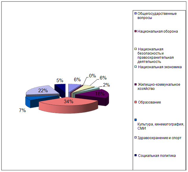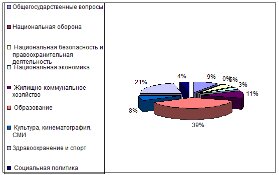 Ст.1 Решения Думы г.Пыть-Ях от 21.12.2006 г. № 123 «О бюджете г.Пыть-Ях на 2007 год» расходы бюджета утверждены в сумме 1 887 862 тыс.руб. Бюджет города утвержден по 8 разделам функциональной классификации расходов в соответствии с бюджетным законодательством. Отдельными приложениями к бюджету № 5 и № 6 представлены расходы бюджета по функциональной и ведомственной классификации расходов с обязательным выделением расходов, осуществляемых за счет субвенций из регионального фонда компенсаций. Также отдельным приложением к бюджету № 11 утвержден перечень главный распорядителей, распорядителей и получателей средств бюджета г.Пыть-Ях на 2007 год в соответствии со ст.25 БК РФ в количестве 14 единиц, где каждому распорядителю и получателю присвоен уникальный код. Бюджет имеет социальную направленность. Наибольший удельный вес в структуре расходов бюджета занимают разделы: 07 «Образование» - 38%, 09 «Здравоохранение и спорт» - 21,4%, 05 «Жилищно-коммунальное хозяйство» - 11,2% (рисунок 2).